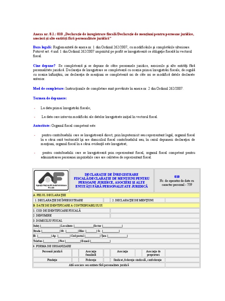 Pdf Declaraţie De Inregistrare Fiscală 2 Declaraţie De Menţiuni I Felul Declaraţiei Ii Date De Identificare A Contribuabilului Miron Emil Academia Edu