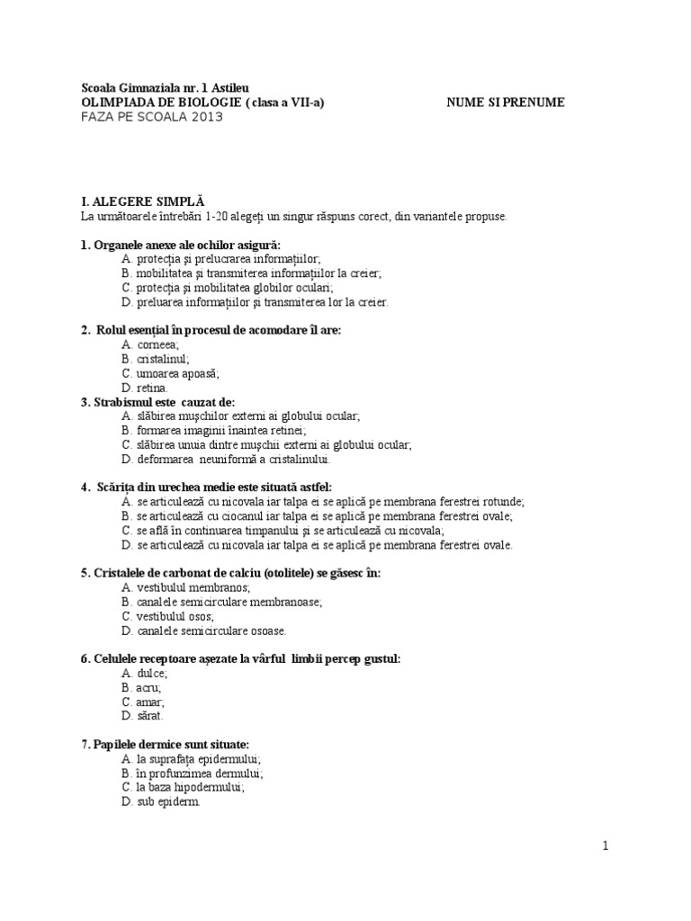 Olimpiada Judeteana De Biologie Clasa A 7 A Subiect Barem